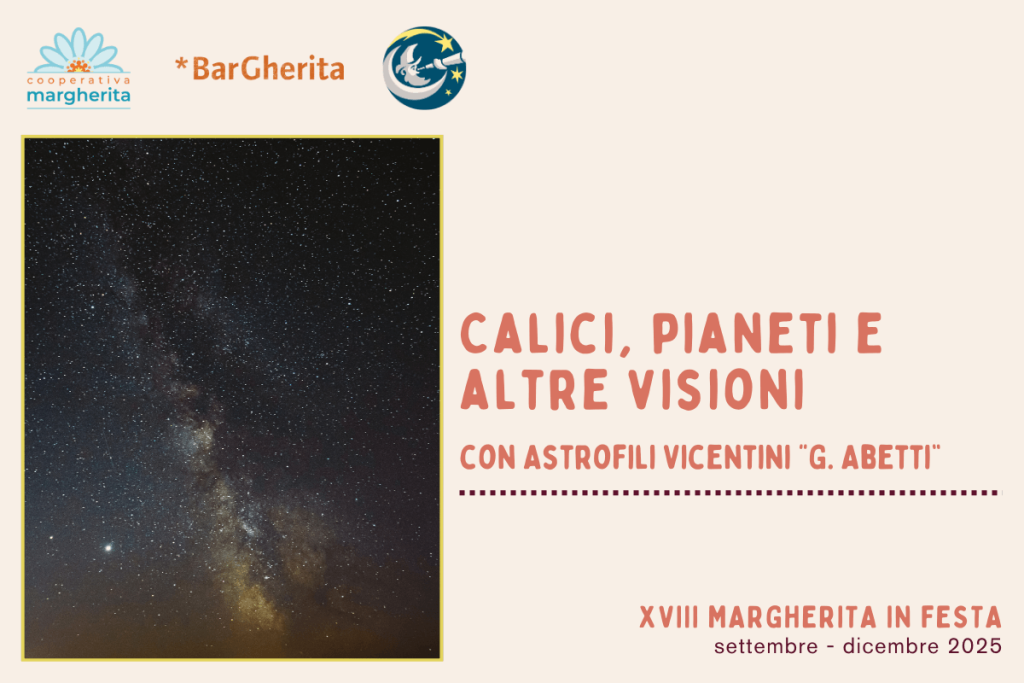 Domenica 14 settembre 2025, ore 20.30 il cielo di Sandrigo diventa protagonista con “Calici, pianeti e altre visioni”, un appuntamento speciale organizzato in collaborazione con il Gruppo Astrofili Vicentini “G. Abetti”. La cornice sarà quella del BarGherita, in via A. Andretto 7, dove vino e stuzzichini accompagneranno un’esperienza unica: l’osservazione di Saturno e delle costellazioni […]