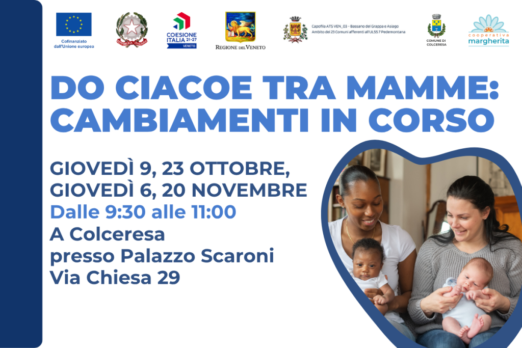 Se sei una neo-mamma con un bambino tra 0 e 1 anno, segnati queste date! Giovedì 9 e 23 ottobre e giovedì 6 e 20 novembre, dalle 9:30 alle 11:00, a Colceresa presso Palazzo Scaroni (Via Chiesa 29), si terrà il gruppo di ritrovo “Do Ciacoe tra Mamme: cambiamenti in corso”. Questo incontro è pensato […]