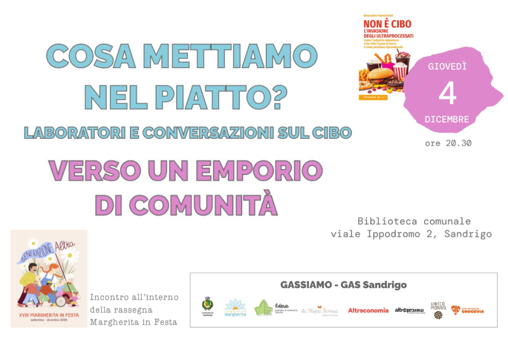 Giovedì 4 dicembre, alle 20.30, la Biblioteca Comunale di Sandrigo (Viale Ippodromo 2) ospita “Cosa mettiamo nel piatto?”, un incontro dedicato a un modo diverso di fare la spesa: più consapevole, più sostenibile e più attento alla comunità.L’appuntamento rientra nella rassegna Margherita in Festa e offre uno spazio di confronto per capire come si costruisce […]