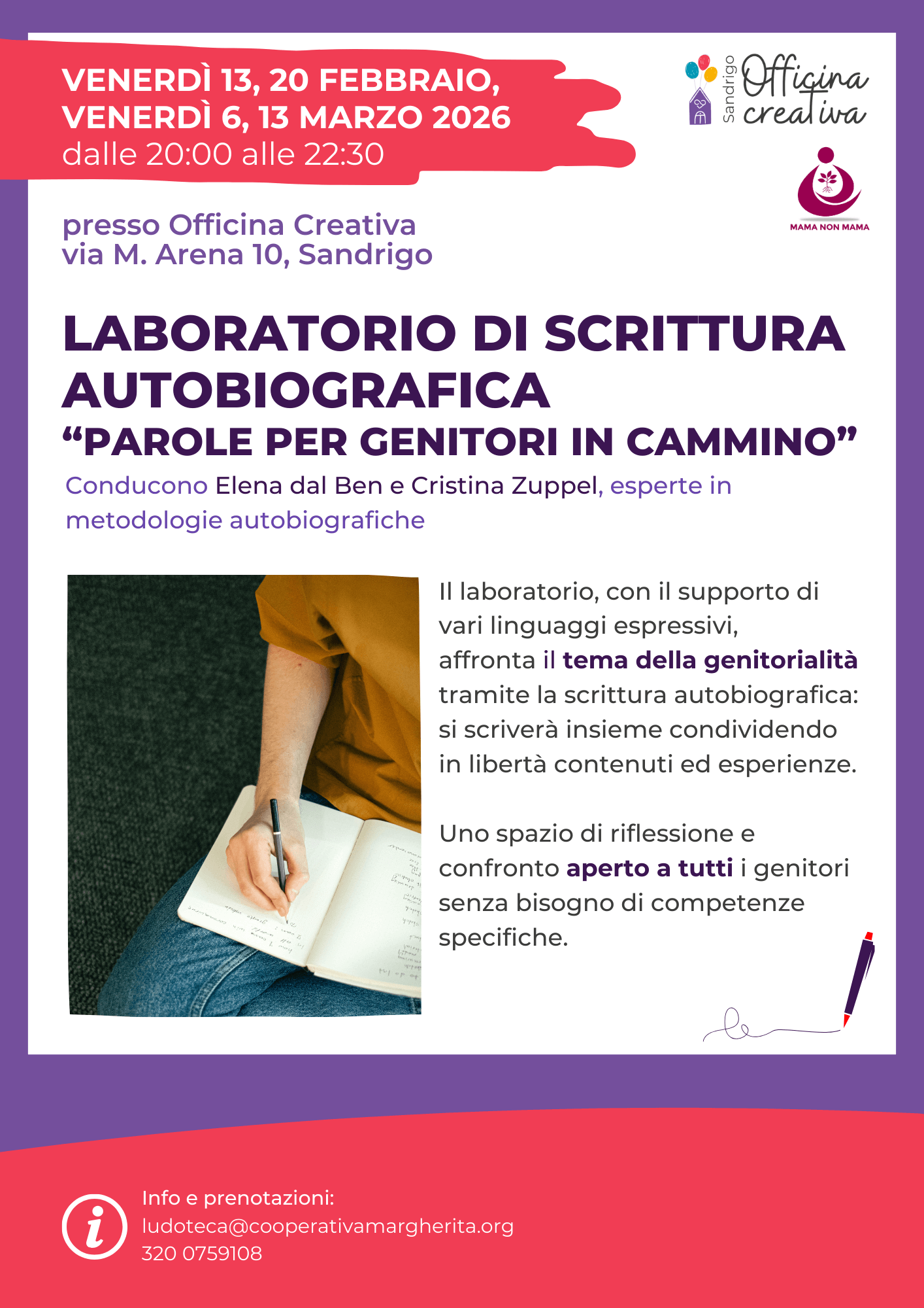Sei un genitore e vuoi prenderti del tempo per riflettere sulla tua esperienza, confrontarti con altri adulti e mettere su carta pensieri ed emozioni? Il laboratorio “Parole per genitori in cammino” ti offre proprio questo: uno spazio creativo dove esplorare la genitorialità attraverso la scrittura autobiografica e altri linguaggi espressivi.
