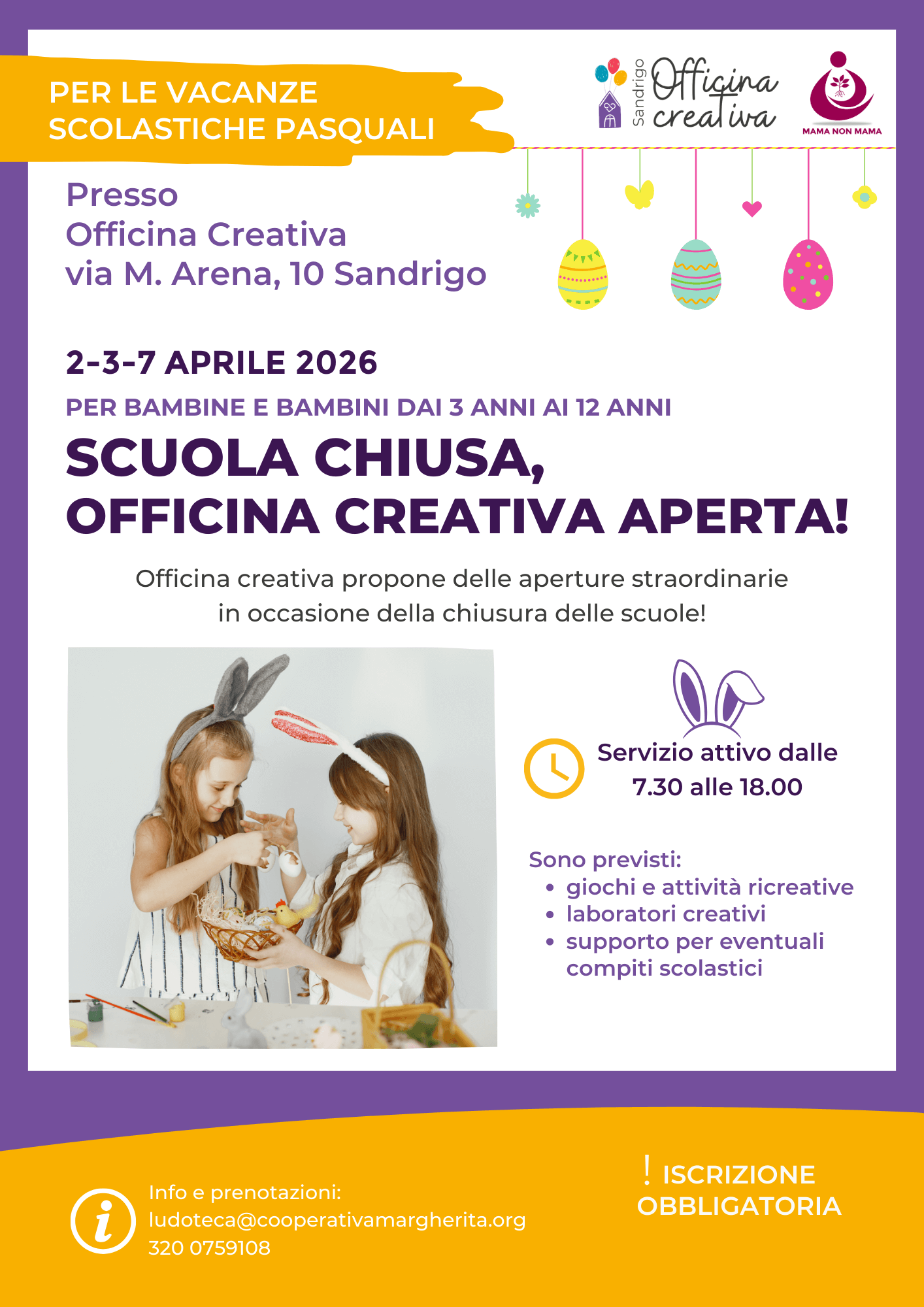 In occasione della chiusura delle scuole per le vacanze pasquali, Officina Creativa apre le porte con alcune giornate straordinarie dedicate a bambine e bambini dai 3 ai 12 anni. Un’opportunità pensata per offrire alle famiglie un servizio educativo e ricreativo, in un ambiente accogliente dove il gioco, la creatività e la socialità diventano protagonisti.