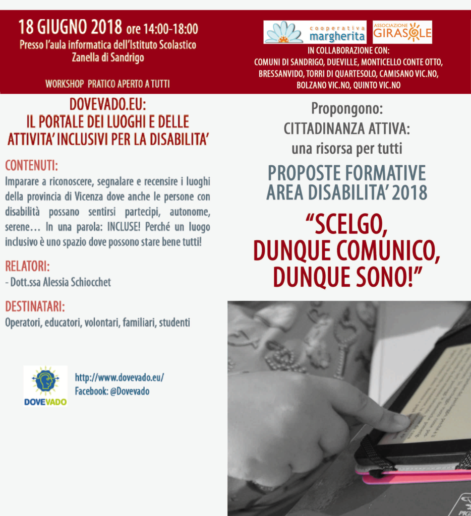 DOVEVADO.EU: IL PORTALE DEI LUOGHI E DELLE ATTIVITÀ INCLUSIVE PER LA DISABILITÀ LUNEDÌ 18 GIUGNO dalle ore 14.00 alle ore 18.00 presso l’aula informatica dell’Istituto Scolastico Zanella di Sandrigo. Workshop pratico, gratuito e aperto a tutti con la dott.ssa Alessia Schiocchet
