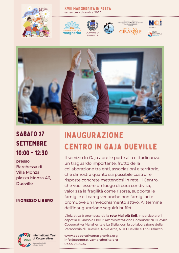 L’iniziativa è promossa dalla rete Mai più Soli, con il capofila Il Girasole Odv, e il supporto dell’Amministrazione Comunale di Dueville, Cooperativa Margherita e La Sisila, in collaborazione con la Parrocchia di Dueville, Nova Arca, NOI Dueville e Trio Bislacco.