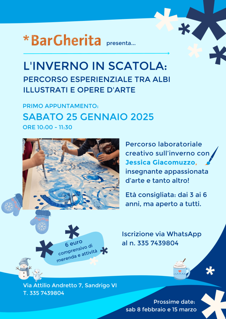 Prende il via L’inverno in scatola, un percorso esperienziale che unisce la magia degli albi illustrati con l’esplorazione dell’arte e della creatività. Il primo appuntamento è fissato per sabato 25 gennaio 2025, dalle 10:00 alle 11:30, presso via Attilio Andretto 7, Sandrigo.