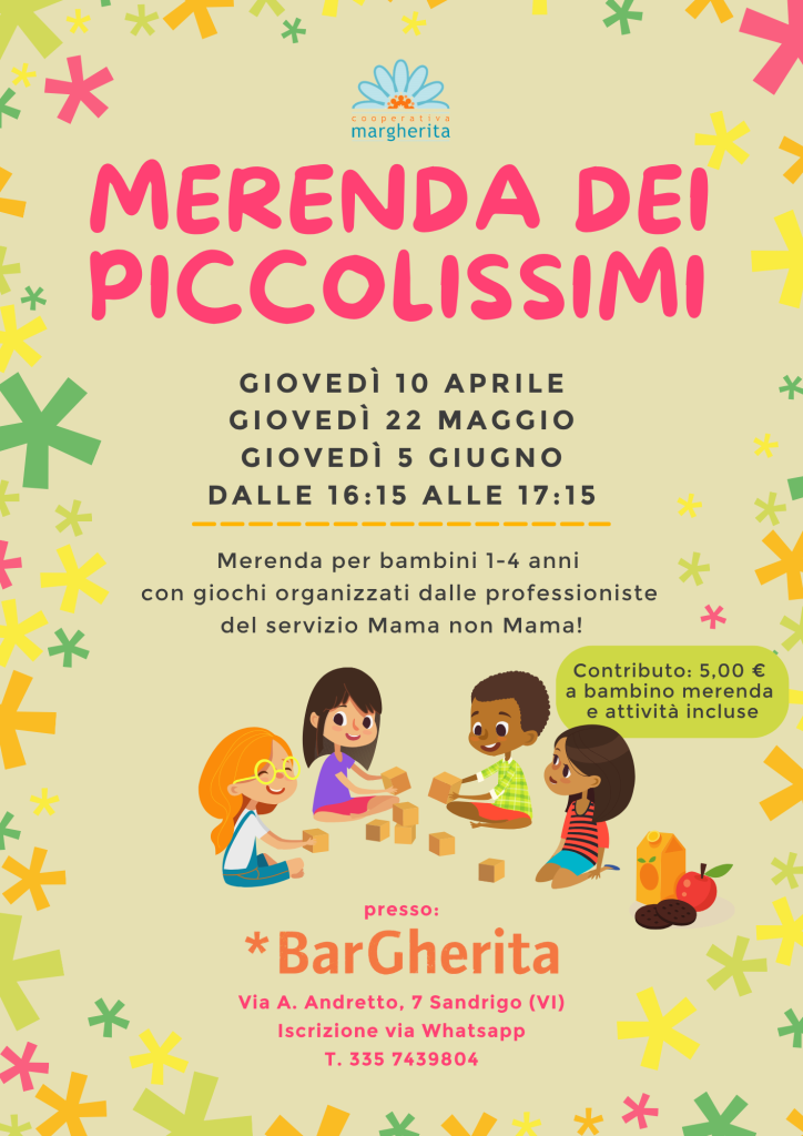 È ritornata la primavera e con lei ripartono gli incontri dedicati ai bambini dai 12 mesi ai 4 anni e ai loro genitori. La Merenda dei Piccolissimi rappresenta un’occasione perfetta per trascorrere un pomeriggio all’insegna del divertimento e della socialità presso il *BarGherita di Sandrigo.