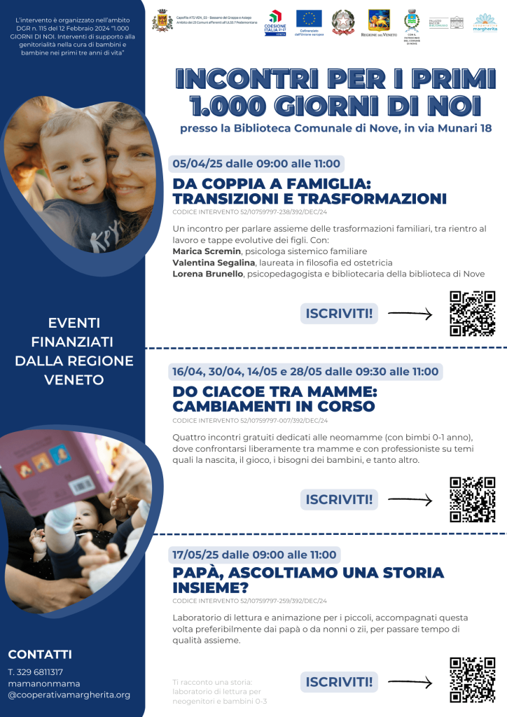 Nel Comune di Nove, il progetto “Primi Mille Giorni” prende vita con una serie di incontri pensati per supportare le famiglie nei primi anni di crescita dei loro bambini. Grazie al finanziamento della Regione Veneto nell’ambito della DGR n. 115 del 12 Febbraio 2024, questi eventi offrono momenti di confronto, crescita e condivisione. Tutti gli incontri si svolgeranno presso la Biblioteca Comunale di Nove, in via Munari 18.